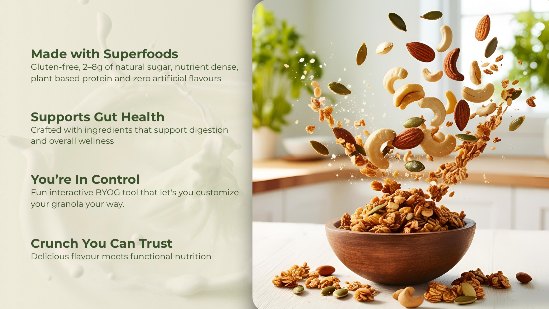 Your granola, Your way! Our interactive BYOG lets you create a blend that’s uniquely yours and even get AI suggestions if you’re unsure.